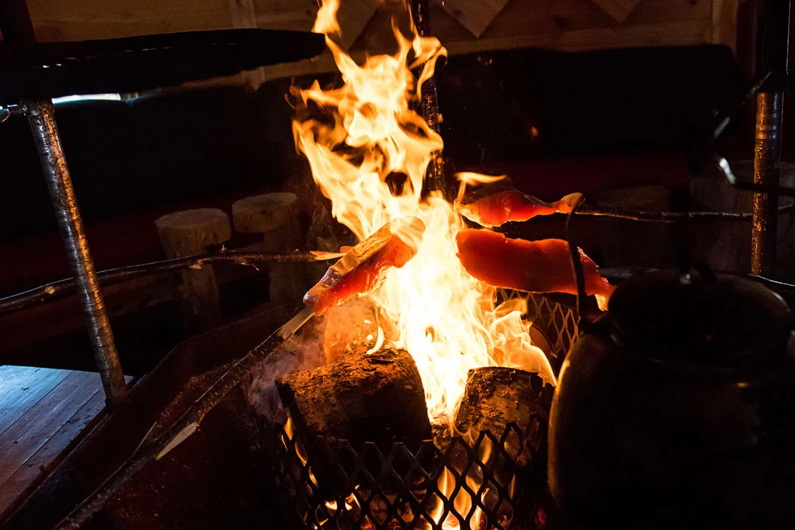 Delicious reindeer meat is waiting, and coffee in a kettle. Making skewers for the meat and working together to gather fuel for the fire is part of the experience.